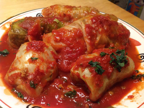 Dans un plat allant au four, disposer les feuilles de chou que vous avez préalablement remplies de farce.